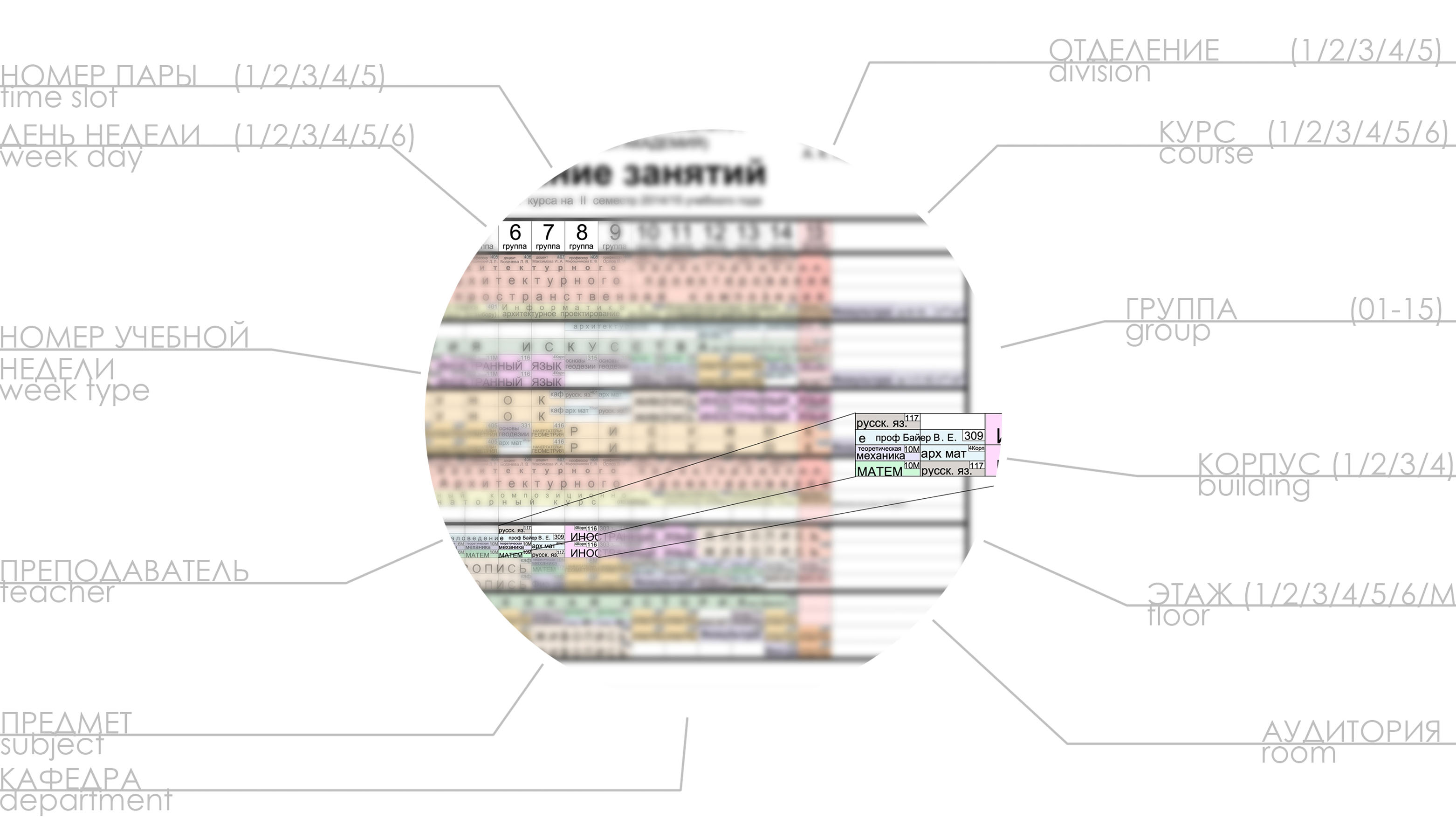 Это значило, что мы можем интерпретировать всю эту сложную структуру как базу данных. Более того, если впоследствии совместить ее с прочими источниками данных: инвентаризация, освещенность аудиторий, предпочтения преподавателей или даже данные о качестве воздуха в реальном времени. Плюс система будет функционировать по принципу проекций - различные данные актуальны для разных функций в различных форматах (таблица активности в конкретной аудитории, таблица занятий для каждого преподавателя, и т.д.).