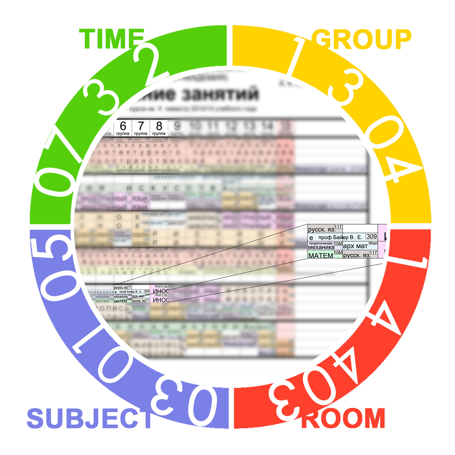 С самого начала целью было не столько визуализация, нежели выявление скрытых характеристик пространства. В процессе мы экспериментировали с различными параметрами: симуляции освещенности аудиторий, инвентаризационные данные, расписание и информация занятости аудиторий, опросы настроения и впечатлений. Этот пост фокусируется на исследование и разработке в области расписания.